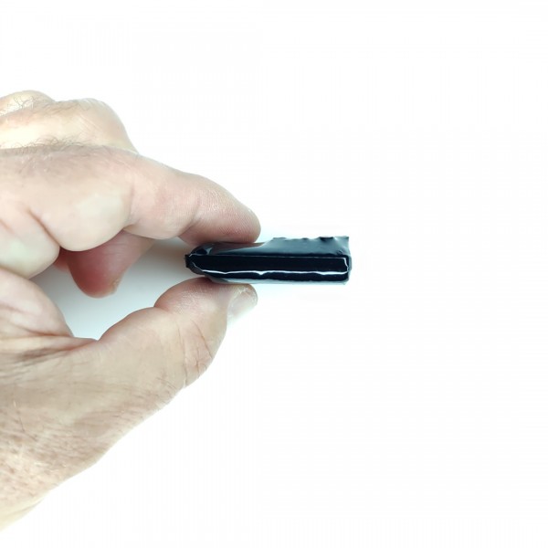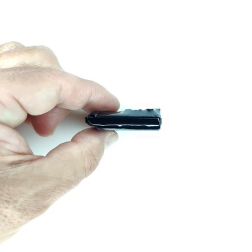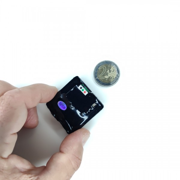 The device is so small that it can be worn or easily hidden practically anywhere. You can record without anyone noticing. It is supplied with three very thin double-sided adhesive strips so that it can be glued onto clothing or other surfaces, both smooth and porous, such as fabrics, wood, polystyrene, etc.